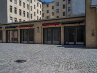 A day in Berlin's urban business district, featuring brick walls, cobblestone streets, and open courtyards. Warehouses and storerooms blend with office buildings in this bustling European city.