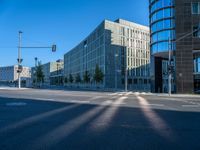 Busy street corner in Berlin's financial district. Modern architecture, high-rise buildings, and office complexes define the city's skyline. Clear sky casts hard shadows on the road, creating a dynamic urban atmosphere.