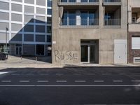 A daytime view of a modern architecture building in Berlin, Germany. The grey facade and composite material windows add a contemporary touch to the city's residential area. The building is located in the bustling business and financial district, surrounded by urban design and public spaces.