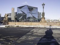 This image captures the essence of a bustling city center. The sunlight casts shadows on the road surface, illuminating the asphalt beneath. A tall building stands proudly in the center, with the shadow of a person reflected on its facade. The street lights are starting to come on as dusk approaches, adding an electric ambiance to the scene. The clouds in the sky add a touch of drama to the cityscape. This photo represents a typical day in the vibrant heart of the city, where the energy of electricity and the beauty of architecture collide.