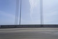This is an image of a highway road with asphalt and composite material. The road extends into the distance, disappearing into the horizon. It is a sunny day with a clear blue sky and white clouds. The motion blur effect adds a sense of movement to the scene. The bridge in the background casts a shadow on the road. The metal railing of the bridge contrasts with the azure sky. The atmosphere is calm and the road is free of ice or tar. The image captures the beauty of infrastructure and the parallel lines create a visually appealing composition.
