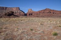 Rugged mountain landscape in Moab, Utah, showcasing red rock formations and open grassy spaces. A dirt road leads to Hurrah Pass and Kane Creek Road, providing off-road tracks amidst the desert. Clear skies and low-lying clouds complete this picturesque scene.