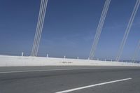 This is an image of a highway bridge taken during the day. The road is made of asphalt and has white lines painted on it. The bridge spans over a body of water, with boats visible in the azure water below. The clear sky above is a vibrant blue, with contrails streaking across it. The motion blur of passing vehicles can be seen on the road surface. The image captures the intersection of land and water, the infrastructure of the bridge, and the beauty of the surrounding atmosphere.