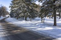 A scenic landscape in Ontario, Canada with snow-covered trees and a winding road. The clear day sky contrasts with the white snow. Nature and vegetation add to the beauty of the scene.