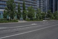 This stock photo showcases a modern urban landscape in Toronto, Ontario, Canada. The image features an empty road with buildings in the distance, surrounded by green trees and bushes. The modern architecture blends seamlessly with the natural vegetation, creating a harmonious and inviting space. The clear blue sky with fluffy clouds adds to the serene atmosphere of this urban setting. The photo captures the essence of Toronto's urban design, showcasing its well-planned thoroughfares, high-rise condominiums, and public spaces. This image is ideal for projects related to architecture, city life, and urban living in Canada.