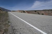 a lone motorcycle parked on the side of an empty road near mountains and hills in the background