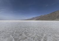 a flat plain in the desert with a bunch of mountains and snow on it under a blue sky