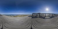 Wide angle 360-degree panoramic photograph of wooden benches on the Delta de l'Ebre coast in Tarragona, Spain. The sun shines on the open space, creating shadows and symmetrical lines. Clear sky and coastal landscape add to the serene atmosphere.
