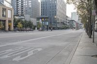 a empty street near some big buildings and trees near a curb sign reading stop on the sidewalk