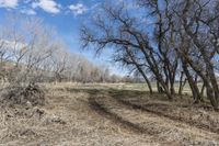 A dirt road winding through the rural landscape of Colorado. Surrounded by grassy fields, forests, and towering trees, the road offers a recreational off-road track. Shadows cast by the winter sun and clear skies create a picturesque scene in the natural environment.