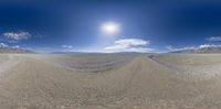 a desert landscape with a wide blue sky and mountains beyond it in the background, you can see an aerial 360 - angle view
