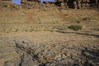 This stock photo captures a captivating desert landscape in Utah, USA. The image features a dog standing on rocks in the desert, outside of a rocky canyon area with brown and tan rocks. The desert terrain is rugged and slopes towards the grassy areas. The clear sky above provides a beautiful backdrop for the red rock formations. The image showcases the natural beauty of this Aeolian landform, with its cobblestone and sand surface. The bedrock and outcrop add texture to the rocky desert landscape. This stock photo is perfect for illustrating the unique beauty of Utah's canyonlands and the natural environment.