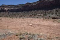 a large open barren area with rocks and scrub brush in the background and cliffs in the background