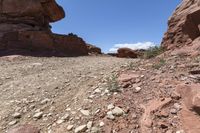 This stock photo features a stunning desert landscape in Utah, USA. The image showcases big rocks and rock formations amidst a vast expanse of red rock terrain. The clear sky and mountain landforms create a picturesque scene. The location is off-road on Lock Hart Road, surrounded by wilderness and canyons. The rocks are prominent bedrock outcrops and gravel formations, displaying the unique geology of the area. It is a perfect representation of the natural beauty and ruggedness of the Utah desert.