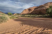 A stunning desert landscape in Utah, USA. The red rock mountains and open spaces create a beautiful contrast with the sandy terrain. The rugged bedrock outcrops and canyons showcase the unique geology of this area.