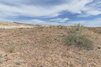 a desert area is shown under blue skies with wispy grass and dead dirt
