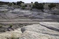 A rugged landscape in Utah's San Rafael Swell. Red rock formations and rock walls contrast with the desert vegetation and grassy groundcover. A dirt road winds through the canyonlands under a cloudy sky.