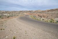 a dirt road in the middle of an arid desert area with sparse bushes and bushes