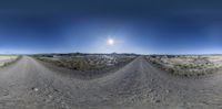 A straight road cuts through the rugged desert landscape of Bardenas Reales in Navarre, Spain. The road surface is covered in gravel as it winds its way around the low hills and plateaus. A clear sky and sunshine illuminate the vast, wild wilderness.