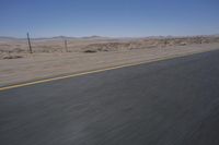 This is an image of an endless road in South Africa, surrounded by the vast African landscape. The road, made of asphalt and covered with tar, stretches into the distance with a motion blur effect, giving a sense of movement. On both sides of the road, there are barren plains with sparse vegetation and mountain slopes in the background. The clear sky above adds to the sense of endlessness. This photo captures the beauty of the South African countryside and represents the freedom of the open road.