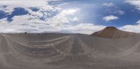 A skateboarding trick in the desert, surrounded by riders. The sandy landscape and open space provide the perfect backdrop for off-road adventures. The mountain range in the distance adds to the natural beauty of the scene.