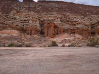 A rugged and gloomy landscape in California, USA. Brown cliffs and rock walls rise out of the desert terrain. Gravel and dirt roads wind through the open space, surrounded by sparse vegetation. The gloomy grey sky adds to the natural environment.