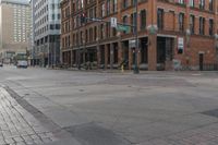 two men walk across a deserted city sidewalk with buildings and a red traffic light on the corner