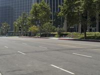 Deserted street in downtown Los Angeles, California. Modern architecture of office buildings lines the roads, with clear skies overhead. Peaceful neighborhood with abundant trees and vegetation. Serene urban design in the bustling business district.