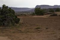 A desolate landscape covered in grey sky and gloomy clouds. Low vegetation struggles to survive on the gravel and dirt surface. Mountains in the distance add to the gloom of the terrain.