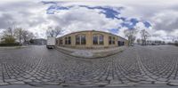 A fisheye lens captures the profile of a classic brick building in the city of Detroit, Michigan, USA. The building's architecture reflects the urban design of the city. Cobblestone roads and warehouses add to the historic charm.