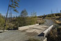 This is a photo of the beautiful landscape in Okanagan Valley, British Columbia, Canada. The image captures a clear sky overlooking a dirt road winding through lush grass and vegetation. In the distance, there is a wooden bridge crossing a creek. The road surface is a mixture of gravel and dirt, blending seamlessly with the natural surroundings. The sloping land lot adds depth and dimension to the scene. This picture represents a typical day in East Kelowna, showcasing the stunning nature and scenery of the Okanagan Valley.
