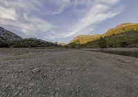 a dirt field with trees and rocks near a body of water and mountains in the distance