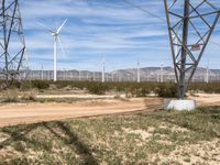 A dirt road winds through California's Mojave Desert, under a clear sky. Electric windmills dot the gravel landscape. Mountains provide a scenic backdrop for this rural day in Los Angeles county.