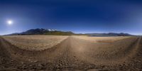 a view of a dirt road in a barren area near the mountains, with the sun in the sky