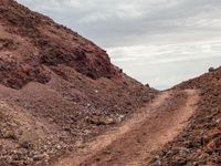 A dirt road winding through a mountainous landscape covered in brown sand. Clouds hang overhead as nature's off-road track traverses formations of gravel and bedrock. The surface slopes gently, creating a stunning view.