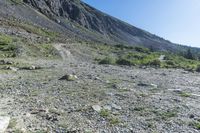 This is an image of a dirt road winding through the mountainous landscape of Colorado, USA. The rugged terrain is covered in grass and vegetation, with rocky outcrops and cliffs adding to the dramatic scenery. The clear sky provides a beautiful backdrop for outdoor recreational activities in this wilderness area. The road leads to Hoosier Pass, a mountain pass known for its scenic beauty and recreational opportunities. This photo captures a sunny day in the highlands, showcasing the natural beauty and geology of this open space in Colorado.