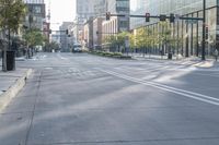 This is an image of the modern architecture in downtown Denver, Colorado, USA. The cityscape showcases high-rise office buildings and condominiums, surrounded by well-designed public spaces and urban infrastructure. The clear sky highlights the sleek lines and concrete structures of the city. In the foreground, a bench is seen, representing the urban lifestyle and bustling city life. The image captures the essence of the metropolitan area, with its contemporary architecture, busy streets, and lively business district.