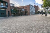 A classic architecture hotel in downtown Los Angeles, California. The cobblestone plaza provides an inviting open space for dining outdoors. Enjoy the clear sky and urban atmosphere.