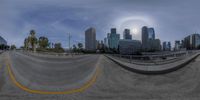 A view of downtown Los Angeles from an elevated road. The modern architecture of high-rise buildings forms the city skyline against a clear sky. The road, lined with trees, leads straight into the urban metropolis.