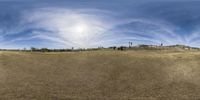 A panoramic view of an open field in Los Angeles, California. The intersection of concrete roads creates a dynamic cityscape against the clear sky. Modern architecture, skyscrapers, and residential buildings dot the landscape. The scene captures the essence of urban design in the heart of downtown Los Angeles.