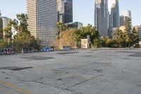 A vibrant day in downtown Los Angeles, California. The clear sky highlights the city's architectural marvels, with skyscrapers and a bustling cityscape. The urban design features open spaces, parking lots, and graffiti walls in the art district.