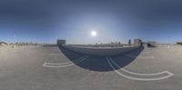 A fish eye view of a street scene in downtown Los Angeles. The clear sky provides a perfect backdrop for the towering skyscrapers and the city's unique architecture. The street is bustling with activity, capturing the vibrant city life of this metropolitan area.