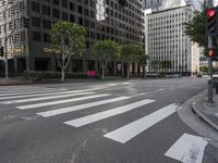 This stock photo showcases a street view in downtown Los Angeles, California, USA. The image features large buildings, traffic light, and trees across from the sidewalk at an intersection. The city's modern architecture and urban design are prominent in this day-time shot. The road, asphalt, and infrastructure reflect the metropolitan area's bustling city life and urban design. A lane, crosswalk, and zebra crossing indicate the human settlement's well-planned urban planning. The picturesque downtown scene captures the essence of urban living in Los Angeles.