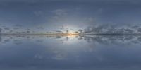 A serene landscape featuring a calm lake reflecting the surrounding trees and mountains. The sky is clear with a few fluffy white clouds, and the sun is setting, casting an orange and pink glow over the horizon. In the foreground, wildflowers bloom along the water's edge, adding splashes of color to the scene.