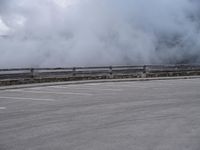 A dramatic grey day in Austria, with mountains and open spaces providing a scenic backdrop. The road surface, Armco barriers, and parking lot create a sense of activity and arrival. Europe's natural beauty on display.