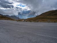 This is an image of an empty asphalt road surrounded by mountains in Austria, Europe. The landscape is dramatic, with storm clouds in the sky and mountains in the background. The road curves through the rural highland, enhancing the sense of adventure and exploration. The road surface, made of tar, adds to the dramatic effect. This photo represents the scenic beauty of the Austrian countryside, with its majestic mountains and breathtaking views.