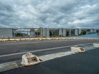 A stunning view of Berlin's financial district at dawn. The modern architecture and dramatic cloud-filled sky create a captivating cityscape. The asphalt road and urban design complement the bustling city life.