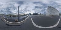 the image is in fisheye mode with a cloudy sky above it and on this side, there are street lined with road signs