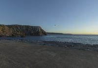 This stock photo features a beautiful beach at dusk with a clear sky and birds flying over the coastline. People can be seen walking on the path along the shore, enjoying the peaceful atmosphere. The image showcases the natural landscape of Portugal, with the ocean waves gently rolling onto the sandy beach. In the distance, a headland and mountains can be seen, adding to the picturesque view. The concrete surface of the pathway provides an open space for leisurely strolls as the day breaks. With its serene ambiance and picturesque scenery, this photo captures the beauty of nature and invites viewers to immerse themselves in the tranquil coastal environment of Europe.