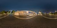 A dark and atmospheric urban scene in Japan. The empty street at dusk is illuminated by street lights and storefronts. The city skyline looms in the background, creating a captivating coastal profile.